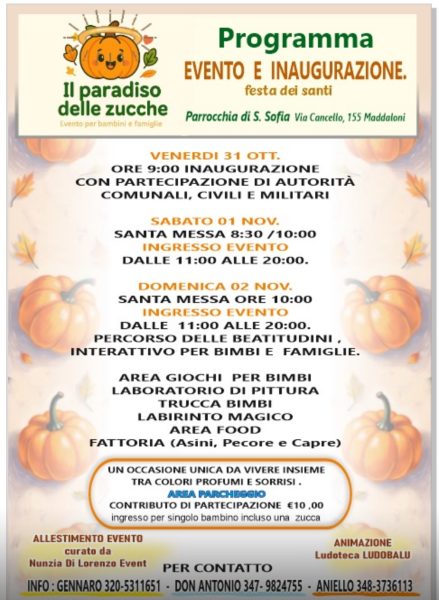 Il Paradiso delle zucche ha aperto ufficialmente i battenti alla presenza del sindaco Andrea De Filippo, del parroco don Antonio Traviso, di tante autorità civili, religiose e militari e naturalmente di tutto il comitato di Santa Sofia e di tanti residenti.