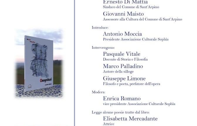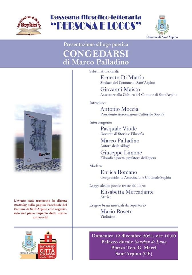 Sant’Arpino-Sarà un incontro all’insegna della filosofia e della poesia quello organizzato per domenica 12 dicembre, dalle 10.30, presso palazzo Sanchez de Luna di Sant’Arpino. Si terrà,infatti, la presentazione della silloge poetica ” Congedarsi” di Marco Palladino scrittore e dott.in filosofia. Dopo i saluti istituzionali del sindaco di Sant’Arpino, Ernesto di Mattia e dell’assessore alla Cultura, Giovanni Maisto, introdurrà l’evento il presidente dell’associazione culturale Sophia, Antonio Moccia. Interverranno: il professor Pasquale Vitale, docente di Storia e filosofia; Marco Palladino, autore della silloge; il professor Giuseppe Limone, filosofo e poeta. A moderare l’incontro sarà Enrica Romano, vicepresidente dell’associazione culturale Sophia. Non mancheranno momenti di sentite letture di alcune poesie del testo, ad opera dell’attrice Elisabetta Mercadante, che completeranno la presentazione del testo. Ad allietare i presenti saranno anche le suggestive note musicali del brani da repertorio eseguiti dal violinista Mario Roseto. L’evento rientra nella rassegna filosofico – culturale “Persona e Logos” e sarà trasmesso sulla pagina Facebook del Comune di Sant’Arpino.