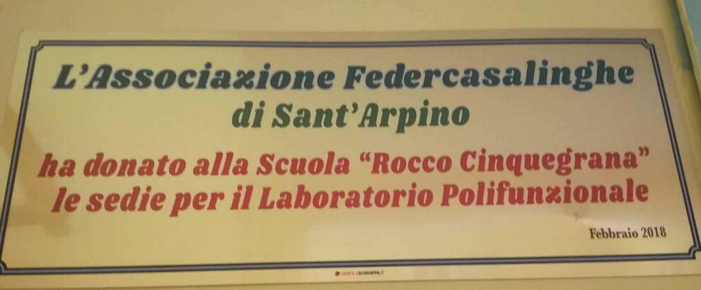 . La preside dell’istituto, dott.ssa Maria Debora Belardo, ha voluto incontrare le associate – alla presenza del capogruppo Gilda Delli Paoli e del membro Iolanda Boerio, nonché insegnante e consigliere di opposizione – “per ringraziarle della donazione effettuata altruisticamente agli alunni santarpinesi. Le sedie vengono quotidianamente utilizzate dai giovani discenti, grati per il gesto solidale. Le donne hanno anche regalato una targa ricordo, che riporta la frase: “L’Associazione Federcasalinghe di Sant’Arpino ha donato alla scuola Rocco Cinquegrana le sedie per il laboratorio Polifunzionale”. Le Federcasalinghe, da diversi anni sono attive sul territorio con tante iniziative benefiche a sostegno della comunità santarpinese. Le associate, in questa occasione, hanno scelto l’istituto scolastico poiché hanno ritenuto importante far sentire la propria calorosa vicinanza ai giovani, in un momento particolare della loro crescita umana e culturale.
