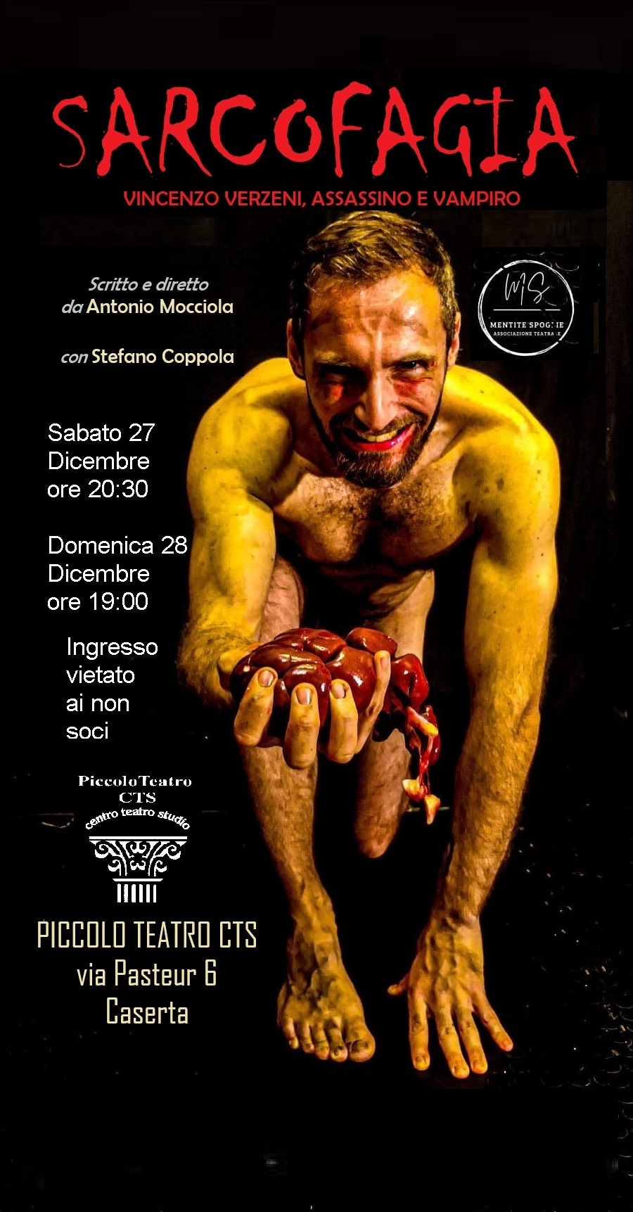In questa pièce, si racconta la storia di Vincenzo Verzeni, detto “il vampiro della bergamasca”, un serial killer arrestato nel 1873. Fu uno dei più discussi e potenti casi mediatici di fine ottocento, capostipite di un genere (la cronaca nera) che da allora in poi diventerà amatissimo dagli italiani. Il caso-Verzeni, omicida e divoratore delle proprie vittime, occupò per mesi le prime pagine dei giornali, scatenando anche una insana e morbosa passione che arrivò a un vero e proprio “feeling” con il killer. Il drammatico processo, la condanna, il dibattito lombrosiano, la questione del sottoproletariato nell’Italia post-unitaria confluiscono nello spettacolo di Antonio Mocciola, in cui Stafano Coppola interpreta un Verzeni completamente nudo, senza nulla in scena se non il proprio corpo esposto e peccatore, di fronte alla propria coscienza. Uno psicodramma forte e violento, che attraversa tutta la gamma dei sentimenti umani. Atroci, proprio perché umani. La sarcofagia, per Plutarco, é il nutrirsi di carne, e per esteso di cadaveri. La sua condanna divenne epica nel suo trattato Del mangiare carne. Il primo vegetariano della storia. Come la maggior parte degli spettacoli di Antonio Mocciola, anche questo è vietato ai minori di diciotto anni.