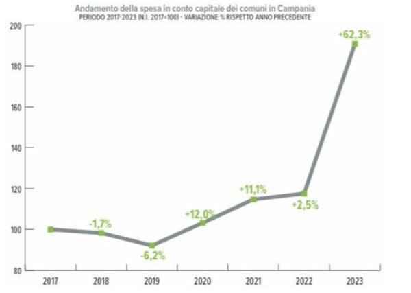 Lavori pubblici, è boom della spesa in conto capitale dei Comuni in Campania nel 2023 con l’aumento del 62% in soli dodici mesi. Sono 2422 i cantieri aperti lo scorso anno, con un avanzamento dei lavori del Pnrr pari al 25 per cento. E cresce del 19,5% rispetto al 2022 il numero dei bandi di gara per lavori pubblici, anche se l’importo cala dell’11,1%. Per quanto riguarda il mercato immobiliare, sono in calo (-5,8%) le compravendite di unità ad uso abitativo in Campania (41.879 nel 2023 rispetto alle 44.447 dell’anno precedente).