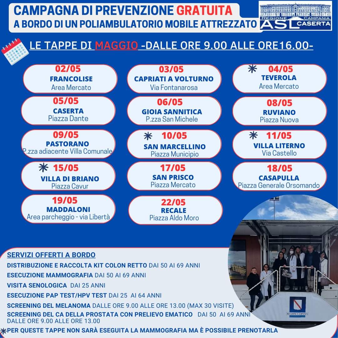 Anche nel mese di maggio sarà possibile accedere agli screening oncologici tra quelli proposti dalla campagna di prevenzione gratuita e senza prenotazione promossa dall’ASL Caserta.