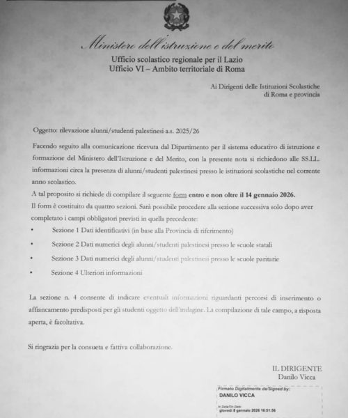 “Il Ministero dell’Istruzione e del Merito ha avviato una rilevazione sulla presenza di studenti palestinesi nelle scuole statali e paritarie per l’anno scolastico 2025/2026. La raccolta dati rimarrà aperta per tutto l’anno con aggiornamenti costanti.