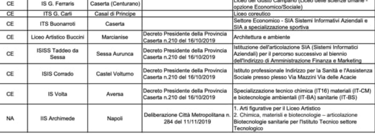 Sono stati approvati anche nuovi indirizzi per le scuole superiori: l’Indirizzo per la Sanità e l’assistenza sociale all’Isis “Corrado” di Castel Volturno; la specializzazione tecnico chimica all’Istituto “A. Volta” di Aversa, il liceo del Gusto all’Isg “Ferraris” di Caserta; il liceo Coreutico all’Itsg “Carli” di Casal di Principe; il Sia (Sistemi informativi aziendali) all’Its “Buonarroti” di Caserta; Architettura e Ambiente al Liceo artistico “Buccini” di Marcianise.