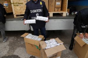 CASERTA – Il Nucleo di Polizia Economico-Finanziaria della Guardia di Finanza di Napoli ha dato esecuzione ad un’ordinanza che ha disposto la misura cautelare della custodia in carcere nei confronti di sette indagati, degli arresti domiciliari per un ottavo e del divieto di dimora per un nono indagato, emessa dal GIP del Tribunale di Napoli, all’esito di articolate indagini coordinate dalla Direzione Distrettuale Antimafia, nei confronti dei soggetti indiziati della partecipazione a un’associazione per delinquere dedita al contrabbando internazionale di tabacchi lavorati esteri provenienti dagli Emirati Arabi Uniti.