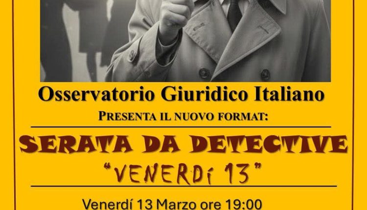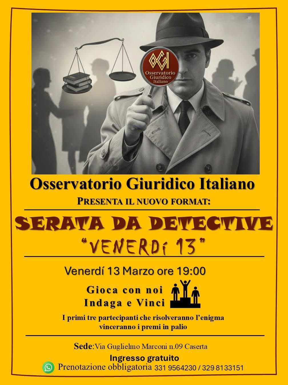 Manca poco ormai all’appuntamento di stasera alle 19:00 presso la sede dell’Osservatorio Giuridico italiano in Via Guglielmo Marconi 9 a Caserta: un caso da risolvere, indizi nascosti da decifrare e sospettati da mettere sotto pressione. Ai partecipanti verrà presentato un caso investigativo originale, ideato interamente dall’equipe dell’OGI. Gli aspiranti detective dovranno ricostruire la verità. Il gioco si svolgerà a squadre ed è previsto un premio finale per i primi tre che risolveranno il caso. Rappresenta il primo appuntamento di un ciclo di eventi che si svilupperanno nel corso dell’anno con l’obiettivo di rendere il mondo giuridico e investigativo accessibile, stimolante e partecipativo, trasformando ogni incontro in una nuova indagine da risolvere. Si tratta eventi che uniscono divulgazione, formazione e intrattenimento. Ingresso gratuito, prenotazione obbligatoria ai numeri 331/9564230 e 329/8133151.