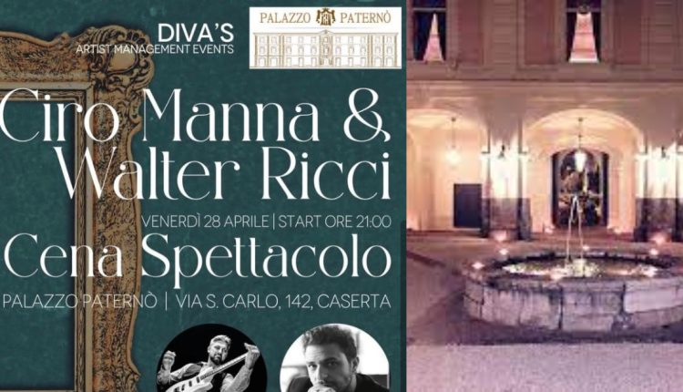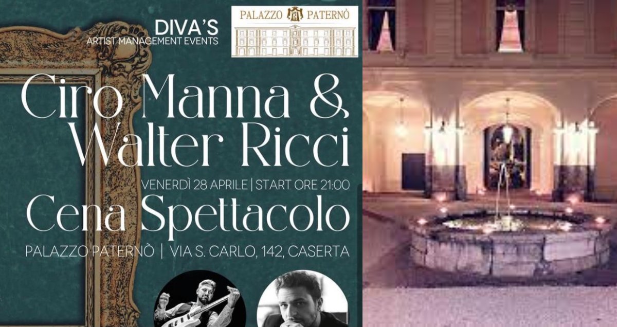 Caserta. Grande serata di musica e divertimento  quella che la Diva’s Artist Management Event di cui è Presidente Maria Concetta Carusone ha organizzato per venerdi’ 28 aprile a Palazzo Paterno’ sito in Via San Carlo n. 142. Si tratta di una cena spettacolo nel corso della quale si esibiranno due grandi artisti , il chitarrista Ciro Manna e il cantante Walter Ricci. Nella splendida cornice dello storico e suggestivo Palazzo Paterno’ vi sarà un’ alternanza continua fra musica e buon cibo che renderanno la serata unica e indimenticabile. Per l’ occasione lo chef ha scelto un menu’ delicato, esaudiente per ogni palato .