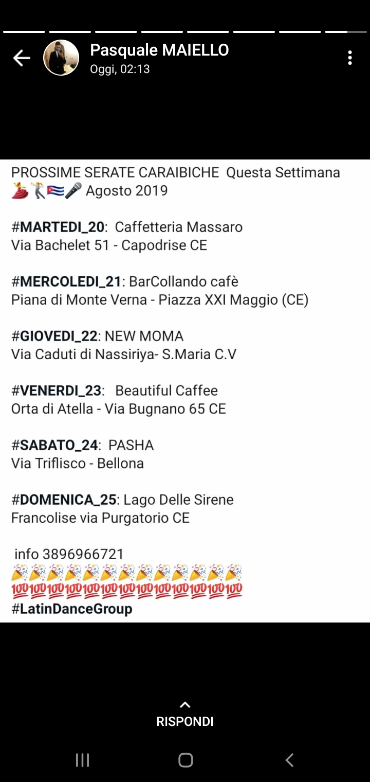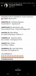 Per coloro che non sono andati in vacanza, e che sono rimasti in città, che stanno subendo la calura africana ma che non vogliono rinunciare ad un po’ di divertimento. Ecco una serie di appuntamenti per gli appassionati che vogliono passare una serata in compagnia cercando di socializzare bevendosi magari una birra o una bibita ghiacciata in attesa della ripresa dei corsi di ballo a settembre della scuola dei f.lli Maiello A SANTA MARIA CAPUA VETERE.