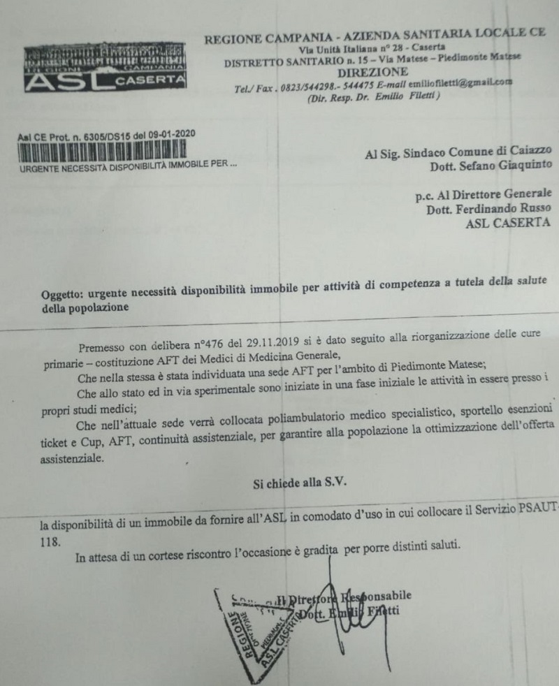 Nello stesso messaggio social precisava ancora che, a seguito delle note con le quali l’ASL di Caserta, il 7 e il 12 maggio scorsi, aveva richiesto al Comune di Caiazzo di individuare una nuova sistemazione per i Servizi citati, il 118 era stato già trasferito dalla sera prima presso i locali della scuola primaria nel rione Garibaldi, in attesa della formalizzazione del contratto per il trasferimento definitivo presso la ex caserma carabinieri, dove avrebbe trovato ospitalità anche la Guardia medica.