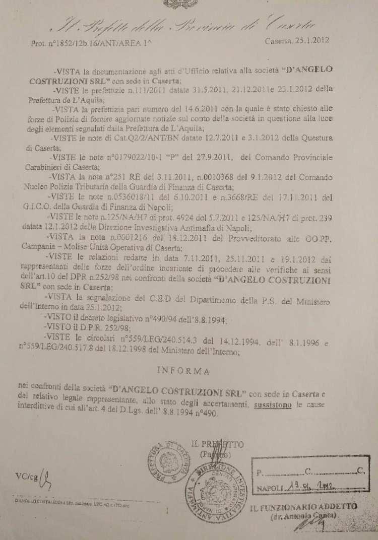 “Si potrà dire che la lettera dell’ASL del 9 gennaio al Comune probabilmente non sia mai arrivata. Può succedere (resta il fatto che noi l’abbiamo trovata e la alleghiamo al comunicato. Certo, se così fosse sarebbe alquanto insolito. Sarebbe strano, infatti, se le lettere, quelle importanti, indirizzate all’Amministrazione comunale di Caiazzo si perdessero lungo il percorso. Si, perché una cosa del genere era già accaduta il 25 gennaio 2012, quando la Prefettura di Caserta avvisò il Comune di Caiazzo, insieme ad altri Comuni dove la lettera arrivò puntualmente a chi di dovere, che la ditta “D’Angelo Costruzioni srl”, che stava eseguendo i lavori di ampliamento del cimitero, era stata colpita da provvedimento di interdizione antimafia (per i più scettici alleghiamo anche in questo caso la lettera).