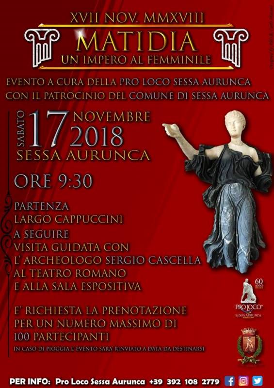 . La Pro Loco “Sessa Aurunca” sta organizzando un altro evento per il proprio territorio, con il patrocinio del Comune di Sessa Aurunca, ovvero una visita guidata con Sergio Cascella, l’archeologo che ha riportato alla luce il Teatro Romano della città, che accompagnerà i presenti al Teatro e alla Sala Espositiva del Castello Ducale, dove sono esposti parte dei reperti ritrovati. La partenza è fissata per le 9:30 presso il Largo Cappuccini per poi proseguire con la visita. L’evento prende il nome di MATIDIA: un impero al femminile e non avrebbe potuto avere madrina migliore, poiché questa nobildonna del monto antico, cognata dell’imperatore Adriano e nipote di Traiano, impresse il suo nome nella storia, per aver finanziato la costruzione e il restauro di molte opere pubbliche tra Minturnae, Sinuessa e Suessa, come il nostro amato Teatro. Di epoca augustea, quest’ultimo si distinse, grazie all’operato di Matidia, per l’eleganza e la finezza dei marmi, degli stucchi e dell’intero complesso, di cui si possono ritrovare ed ammirare i resti nella Sala Espositiva. Qui si può contemplare, inoltre, la più attraente delle testimonianze, ovvero la splendida statua di Matidia, capolavoro di arte romana, una scultura bicroma di marmo bianco e bigio, vestita con un leggero chitone, tipico abito greco che, indossato per l’eternità dalla nobildonna, appare gonfiato dal vento. Sarà possibile scoprire questo, ma molto di più durante la particolare passeggiata e con una guida d’eccellenza. La Pro Loco coglie l’occasione per ringraziare, inoltre, la dottoressa Antonella Tomeo della Sovrintendenza Archeologica Belle Arti e Paesaggio per le Province di Caserta e Benevento per la sua preziosa collaborazione.