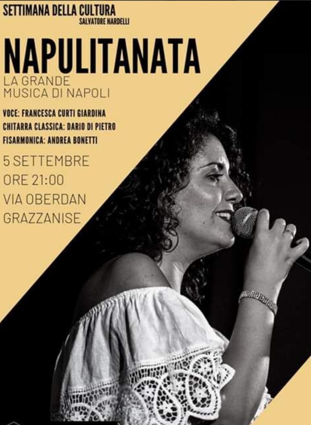 Grazzanise (CE) – Dopo il soldout di Napoli lo scorso 9 agosto, “Napulitanata“, concerto per voce chitarra e fisarmonica che accompagnano lo spettatore in una rivisitazione di brani della musica napoletana classica e contemporanea, arriva a Grazzanise il 5 settembre 2019 secondo appuntamento della rassegna di arte e spettacolo di Salvatore Nardelli.