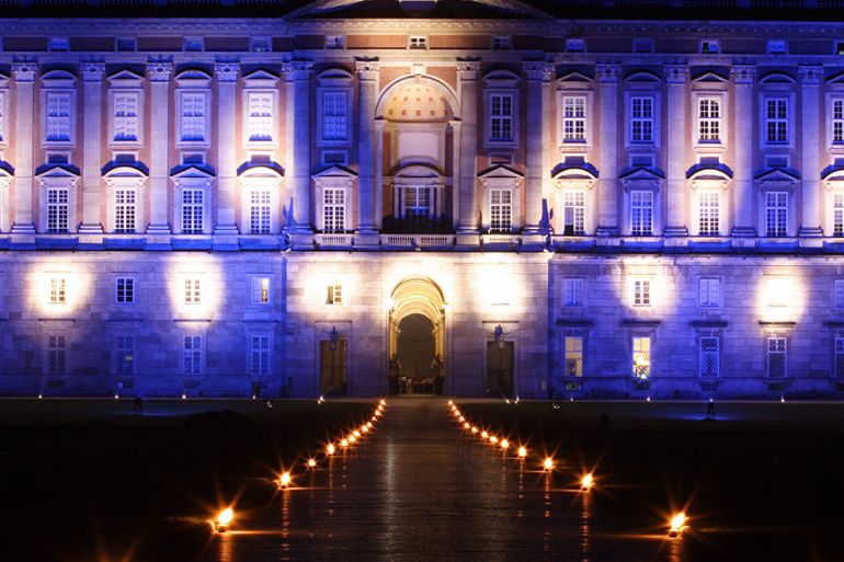 Nella frescura dell’imbrunire, ognuno potrà ripercorrere, attraverso le Sale Vanvitelli, aperte per l’occasione, lo splendore concepito dal genio del settecento; successivamente sarà, poi, dolcemente condotto nell’epoca ottocentesca, attraversando la Sala delle culle, l’anticamera e la Cappellina di Pio IX, la Camera da letto e le anticamere di Gioacchino Murat, la Camera da letto e le anticamere di Francesco II, ecc