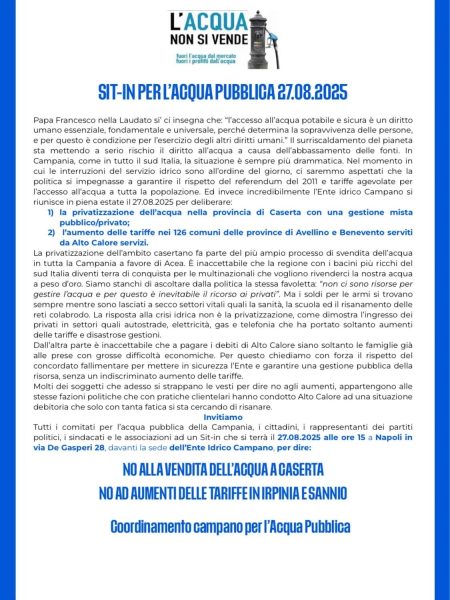 Per questo il 27.08.2025 alle ore 15.00 Sinistra Italiana affiancherà il Coordinamento campano per l’Acqua Pubblica in sit-in sotto alla sede dell’Ente Idrico Campano, a via De Gasperi 28.