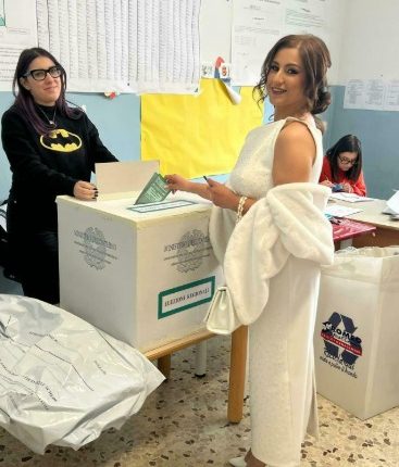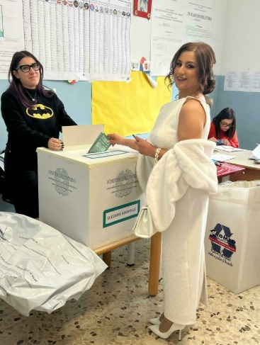 È successo ad Ercolano, dove la scena – insolita e al tempo stesso di grande impatto simbolico – ha lasciato stupiti gli elettori presenti nel seggio. Anna Ruocco e Fabio Scarrone, i due novelli sposi, si sono presentati al seggio di via Marconi con l’abito nuziale ancora addosso, tra lo stupore generale e una pioggia di sorrisi: un ingresso grandioso che ha immediatamente attirato l’attenzione dei presenti. Naturalmente irresistibile la tentazione di immortalare il momento: gli scatti, rimbalzati in rete nel giro di poche ore, sono rapidamente diventati virali.