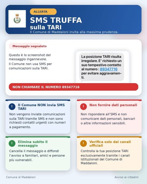 Il Comune di Maddaloni informa i cittadini che stanno circolando SMS ingannevoli che segnalano false irregolarità sulla TARI e invitano a contattare numeri telefonici a pagamento.