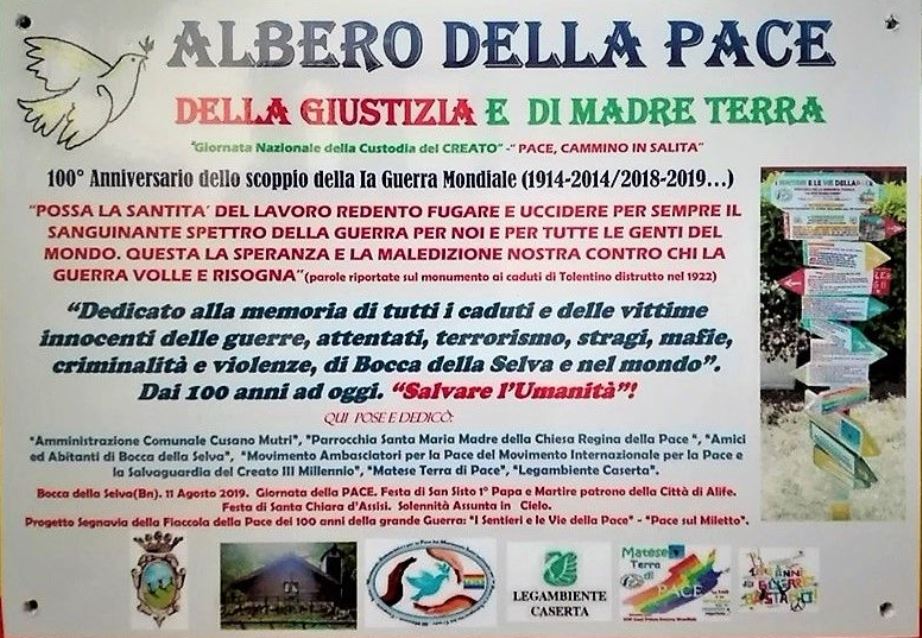 ALIFE – Nell’ambito dei percorsi dei 100 anni della grande guerra e del progetto: “Segnavia della Fiaccola della Pace: “I Sentieri e delle Vie della Pace”, nel giorno in cui ricorre la Solennità di San Sisto 1° p. e m., Patrono della Città di ALIFE e della festa di Santa Chiara d’Assisi, nella Giornata dedicata alla Pace universale, il Movimento Internazionale per la Pace e la Salvaguardia del Creato III Millennio, in collaborazione con gli Amici ed Abitanti di Bocca della Selva fra cui Enrico D’ANGERIO e Rosa SANTANGELO, con la parrocchia “Santa Maria Madre della Chiesa, Regina della Pace” guidata dal parroco don Donatello CAMILLI, con Legambiente Caserta presieduta da Nicola D’Angerio, e con il Patrocinio del Comune di Cusano Mutri retto dal Sindaco Giuseppe Maria Maturo, verrà intitolato il 1° Albero della Pace a Bocca della Selva (Monti del Matese).