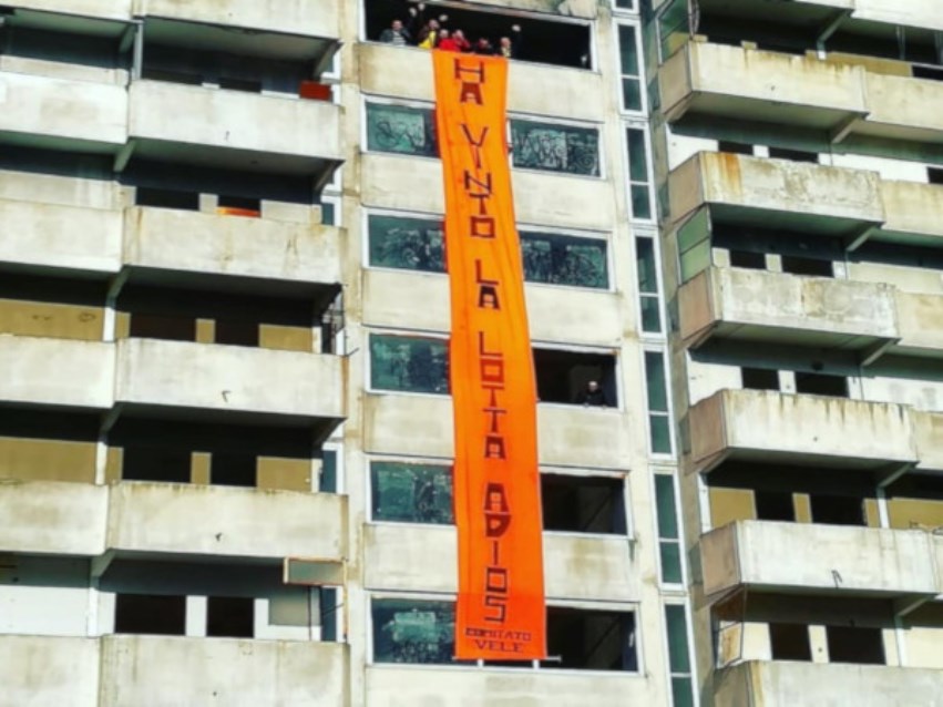 Gli abitanti del Lotto M e i membri del Comitato hanno srotolato uno striscione all’interno della Vela verde, quella che sta per essere cantierizzata, recante la scritta “ha vinto la lotta, Adios”. L’abbattimento, come prevede il contratto, deve compiersi entro i 180 giorni dalla cantierizzazione.