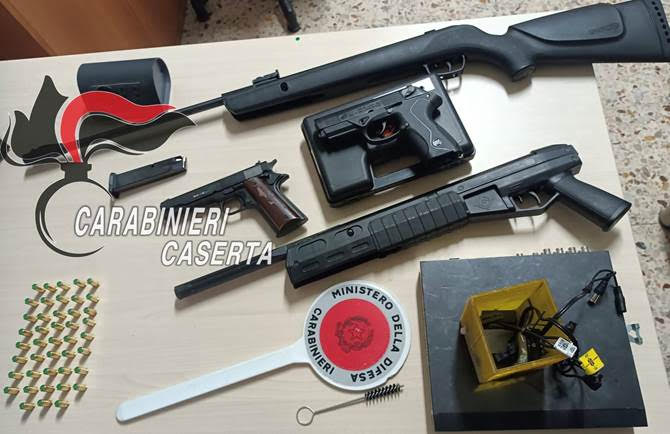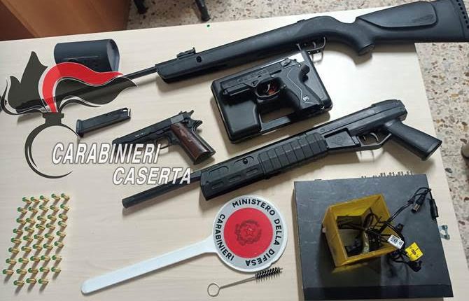 La successiva perquisizione domiciliare, eseguita a carico dell’uomo, ha consentito di rinvenire all’interno di un borsone occultato nel locale adibito a ripostiglio, un secondo fucile ad aria compressa cal. 4,5, 2 pistole a salve cal. 8, prive di tappo rosso di sicurezza, e 43 munizioni.
