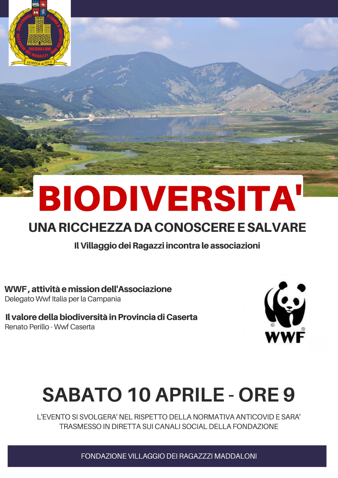 “Il Villaggio dei Ragazzi si conferma punto di riferimento importante per le organizzazioni di volontariato e le diverse espressioni di cittadinanza attiva del territorio campano. Il percorso avviato dal nostro Ente ha l’obiettivo di diffondere sempre più tra i nostri studenti la cultura della sostenibilità ambientale, che, tra l’altro, è centrale nel programma scolastico delle ore legate all’educazione civica”. Con questa dichiarazione, Felicio De Luca, Commissario straordinario della Fondazione Villaggio dei Ragazzi, dà il via alla seconda e conclusiva giornata “virtuale” sulla difesa della Biodiversità (il primo appuntamento si è tenuto lo scorso 20 Marzo). L’evento si terrà in diretta streaming, sulla pagina ufficiale Facebook della Fondazione sabato, 10 aprile p.v., a partire dalle ore 9.00. Interverranno Raffaele Lauria, chimico e delegato del WWF Italia per la Campania, che illustrerà le attività e la missione del WWF, che da anni combatte il degrado del pianeta, e Renato Perillo, biologo e consigliere del WWF Caserta, che invece affronterà il tema della Biodiversità nel territorio casertano.