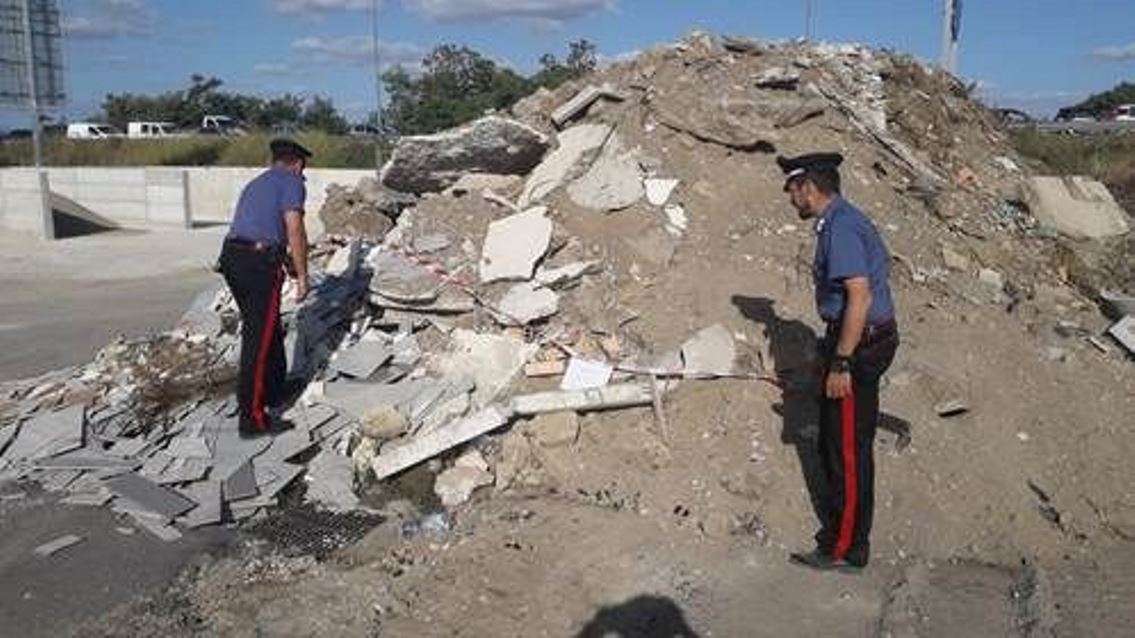 Ø un cumulo di rifiuti, non suddiviso per categorie omogenee, stimato a vista in 170 mc di materiale di demolizione e costruzione misto a terra, in particolare mattonelle, mattoni forati, blocchi di cemento armato, ferro, guaine bituminose, blocchi in lapil-cemento e tubi corrugati in plastica;