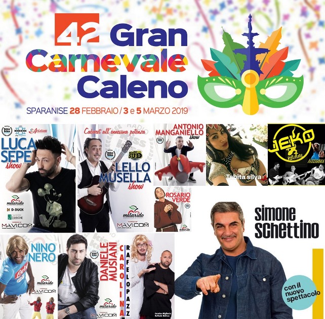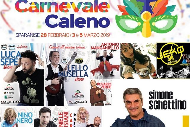 SPARANISE ‐ Come da tradizione, anche quest’anno Sparanise festeggerà il suo Gran Carnevale Caleno. L’edizione 2019, la 42esima, è organizzata direttamente dal Comune di Sparanise è risultata vincitrice del bando della Regione Campania come evento a rilevanza turistica regionale POC 2014‐2020. Come da tradizione, si svolgerà secondo lo schema consolidato delle tre giornate dedicate alla sfilata dei carri allegorici di giovedì 28 febbraio, domenica 3 e martedì 5 marzo. Ecco nello specifico tutto il programma.