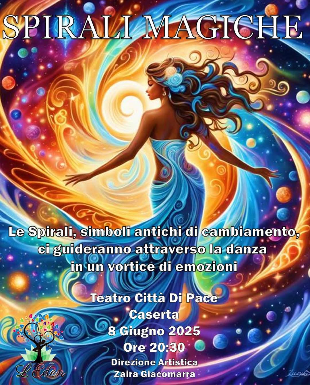 Dopo l’enorme successo di The Colors of Dreams, lo spettacolo che lo scorso anno ha incantato il pubblico casertano con la sua intensità e bellezza, l’EDEN ASD, sotto la direzione artistica della maestra e coreografa Zaira Giacomarra, torna a sorprendere con una nuova, potente creazione: Spirali Magiche.