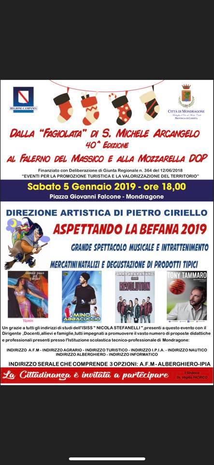 ” Sono appena terminati i fuochi di artificio che annunciano un 2019 scoppiettante – ha dichiarato Pietro Ciriello- e da subito, ci mettiamo al lavoro per donare alla città di Mondragone un giorno della Befana sereno e pieno di sorprese, di cultura, di enogastronomia, di musica, di risate, di scuole attive e protagoniste, di giovani motivatissimi e docenti attivissimi, di cittadini e associazioni determinati a risollevare in alto una città, Mondragone, ricca di storia, di arte e di buon cibo. La festa del 5 gennaio in Piazza Falcone e’ la festa di tutta la citta’ di Mondragone con regali per tutti i bambini, accoglienza per turisti e famiglie e musica, risate e buon cibo. Il nostro augurio e’ quello di un sereno e radioso 2019″.