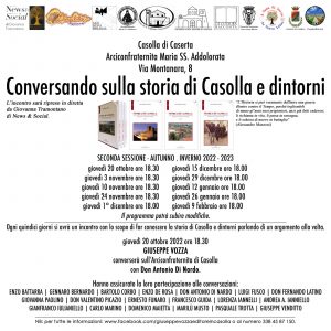 Caserta- Riprende giovedì 20 ottobre il ciclo di conferenze ” Conversando sulla storia di Casolla”. Gl incontri, ideati da Giuseppe Vozza che è anche il principale relatore, prendono spunto dalla sua opera letteraria sulla storia della frazione del capoluogo e accompagnano i partecipanti in un viaggio attraverso racconti, storie ed aneddoti riguardanti il piccolo borgo ai piedi dei colli tifatini. Ricordiamo che Giuseppe Vozza è stato nominato di recente dal sindaco Carlo Marino proprio consulente onorario per il Comune di Caserta per la rivalutazione e per il rafforzamento delle frazioni pedemontane nell’ottica di una migliore e maggiore conoscenza storico-culturale e per eventuali sviluppi socio-economico-turistici. Don Antonio Di Nardo, il nuovo arciprete di Casolla ha dato la sua disponibilità ad essere presente nella maggior parte degli incontri. Di seguito la locandina con il calendario degli incontri programmati che si terranno, di giovedì, nell’arciconfraternita di Maria SS. Addolorata a Casolla appunto: