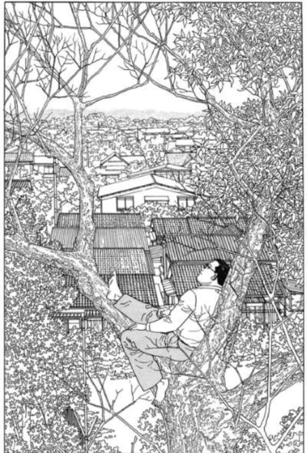 In questo cammino, da un punto di vista stilistico, è da evidenziare la scelta di Taniguchi di utilizzare le onomatopee per segnalare i suoni più deboli, quelli più impercettibili, che increspano di poco il silenzio in cui il paesaggio e le cose sono immersi. Le onomatopee, solitamente, vengono utilizzate per marcare i suoni più forti, quelli legati ai momenti topici di un’azione. Qui, dove l’agire sfuma taoisticamente nel non-agire, nei passi e negli sguardi contemplativi, le onomatopee devono indurre lo spettatore ad allargare lo spettro della propria attenzione, per rivolgere lo sguardo a quei dettagli apparentemente insignificanti del quotidiano che emanano un insolito splendore. L’estetica di Taniguchi, difatti, potremmo definirla né un’estetica del bello né un’estetica del sublime, ma un’estetica del mistero. Gli oggetti che di volta in volta colpiscono lo sguardo dell’uomo non sono concrezioni visibili né di una perfetta compostezza né latori di quella compresenza di fascinazione e repulsione propria degli oggetti capaci di evocare il sentimento del sublime. Gli oggetti che l’uomo incontra compongono una sorta di miniatura del quotidiano: una conchiglia che spunta tra i fili d’erba del proprio giardino, le antenne di una televisione, la ruota di una bicicletta che sporge dal cortile, lo sciame di case osservate dalla cima di un albero. Tutto fa sobbalzare il cuore dell’uomo, ricucendo il suo sguardo allo stupore originario del bambino che osserva tutto con occhi assolutamente vergini, per la prima volta. Tutto ciò che egli vede e sente, però, lo ha già visto, lo ha già sentito. Ma è come se solo in quel momento vedesse davvero e sentisse davvero. Perché? Perché egli, come insegna Dōgen, vede il mistero abbacinante dell’esistenza di visto e veggente. Ogni esperienza, dalla fragile caduta della pioggia al volo liberatorio di un uccello, diventa testimone della straordinarietà di ciò che è ordinario. Aprire gli occhi alla segreta melodia del mistero che annoda silente i fili impercettibili delle cose, significa acquisire una nuova innocenza; vuol dire conoscere per davvero: ossia, nascere insieme alla cosa conosciuta, sentirsi parte di un parto continuo; un parto in cui le cose non gemono di dolore, ma di stupore.