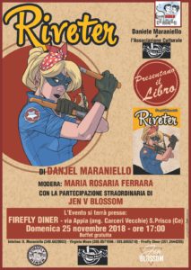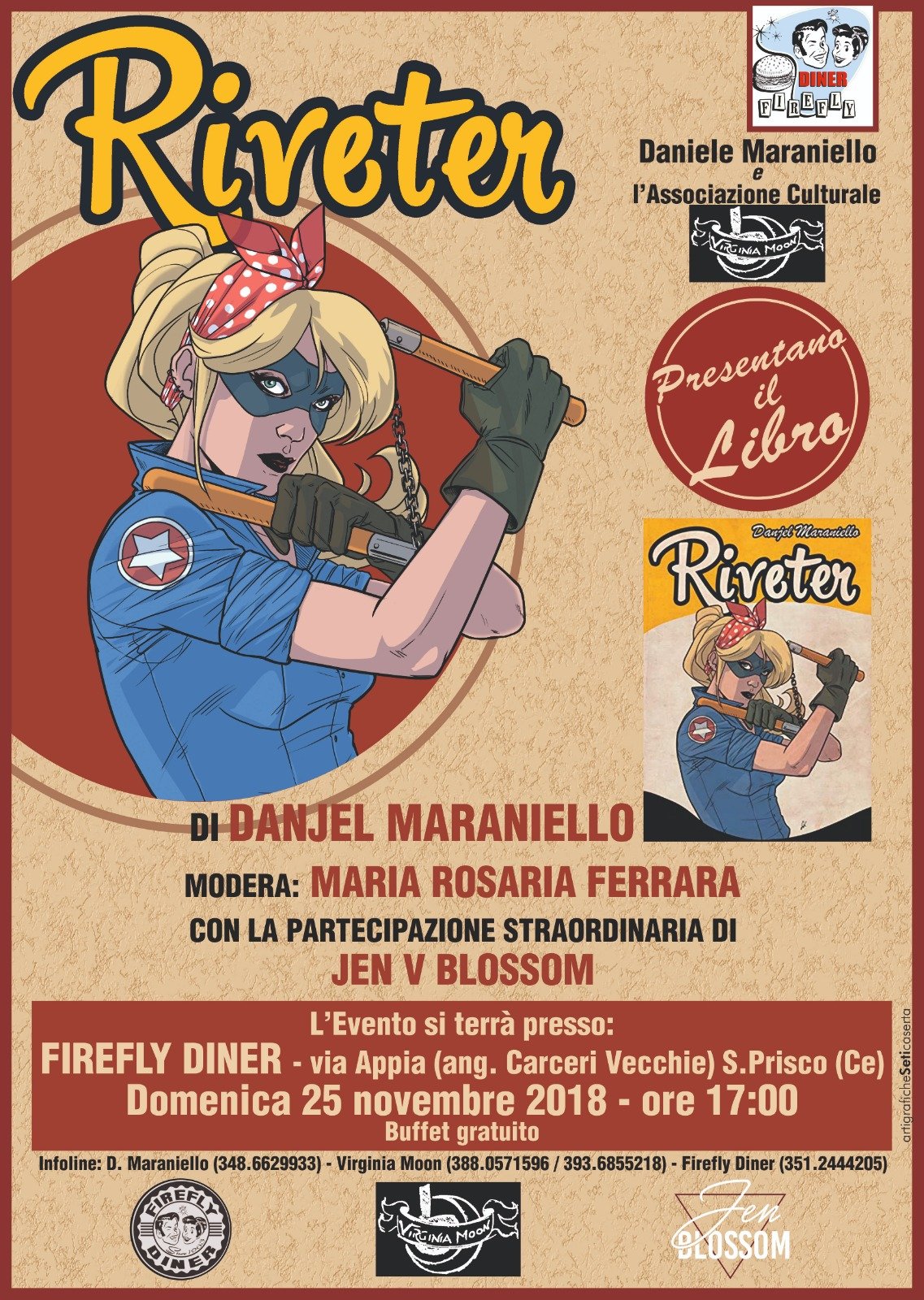 Domenica 25 novembre alle ore 17 c’è il lancio ufficiale del libro. Non è una data scelta a caso, dato che il 25 è la giornata mondiale contro la violenza sulle donne e non c’è una data significativa per presentare Riveter. La presentazione, organizzata in collaborazione con l’associazione culturale Virgina Moon, sarà al Firefly Diner di San Prisco e ci saranno tante cose interessanti, dai gadget abbinati all’acquisto del libro (che costa solo 5 euro!) , alla musica e al buffet gratis. Assieme a me ci saranno Maria Rosaria Ferrara in veste di moderatrice e Jen V Blossom a creare la giusta atmosfera con la sua musica. Queste altre sorprese che non voglio rivelare ancora. Vi aspetto tutti domenica alle 17, al Firefly Diner di San Prisco.