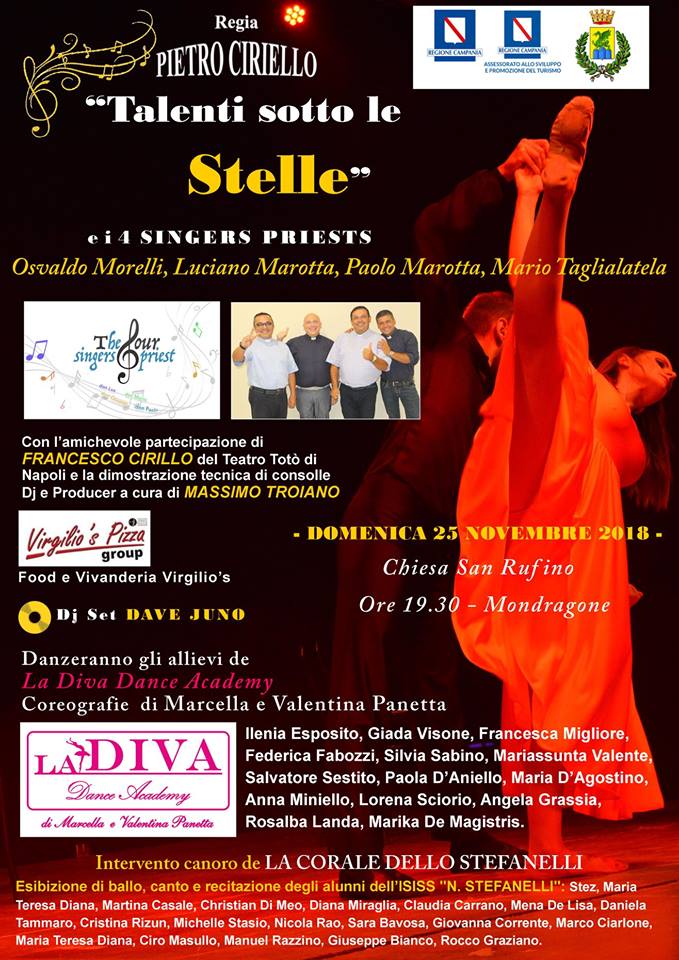 Ma ecco le giovani risorse: danzeranno con le coreografie di Marcella e Valentina Panetta gli allievi de “La diva dance Academy”: Ilenia Esposito, Giada Visone, Francesca Migliore, Federica Fabozzi, Silvia Sabino, Mariassunta Valente, Salvatore Sestito, Paola D’Aniello, Maria D’Agostino, Anna Miniello, Lorenza Sciorio, Angela Grassia, Rosalba Landa e Marika de Magistris.