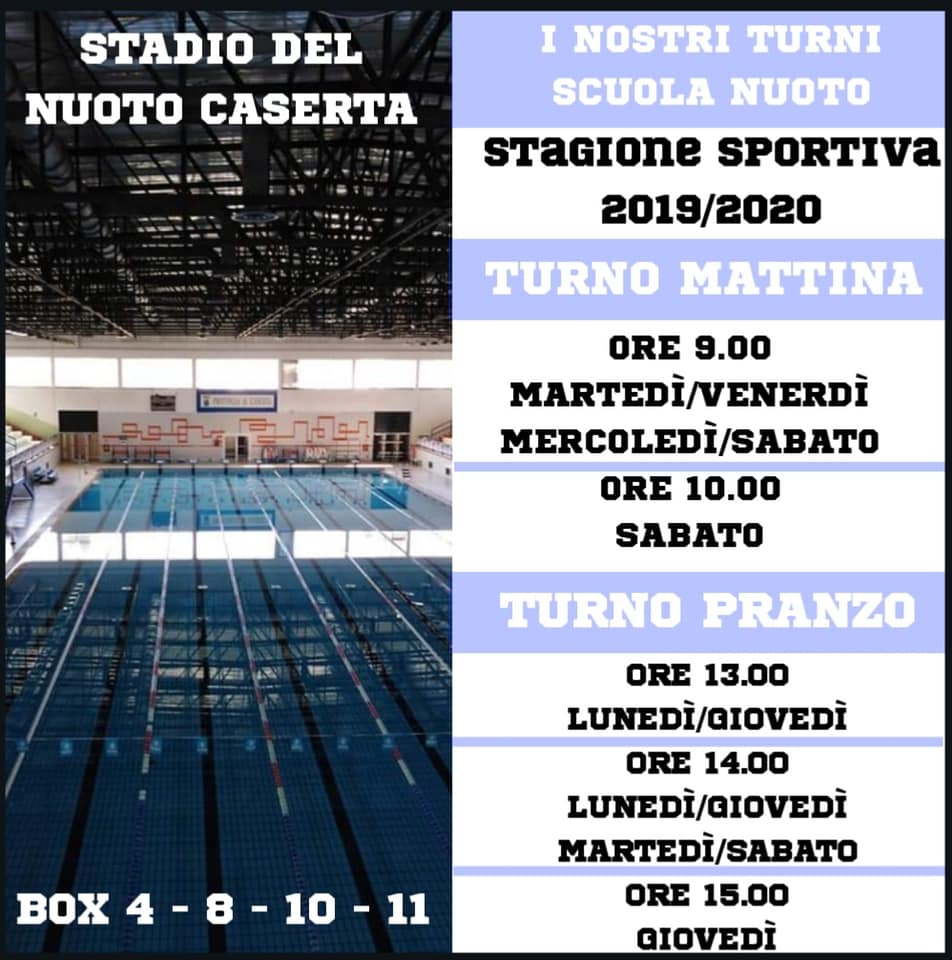 Ecco i turni ed i giorni nel quale è possibile praticare l’attivista sportiva natatoria  all’impianto sportivo di Caserta  di vial Laviano.