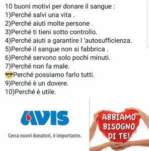 . Dopo aver effettuato la donazione di sangue, i volontari avranno il tesserino con il proprio gruppo sanguigno ed una serie di analisi completamente gratuite, comprese quelle sull’epatite B, epatite C, AIDS, sifilide. L’invito è rivolto a tutti i cittadini sidicini e dei comuni viciniori, donatori abituali ma anche soprattutto agli occasionali, coloro cioè che non hanno mai compiuto questo bellissimo gesto di altruismo ed umanità. Viviamo una situazione di grave emergenza ed è necessaria da parte di tutti la massima partecipazione per far fronte ad una criticità che interessa in questa fase soprattutto i pazienti talassemici e leucemici che come è noto necessitano di frequenti trasfusioni salvavita