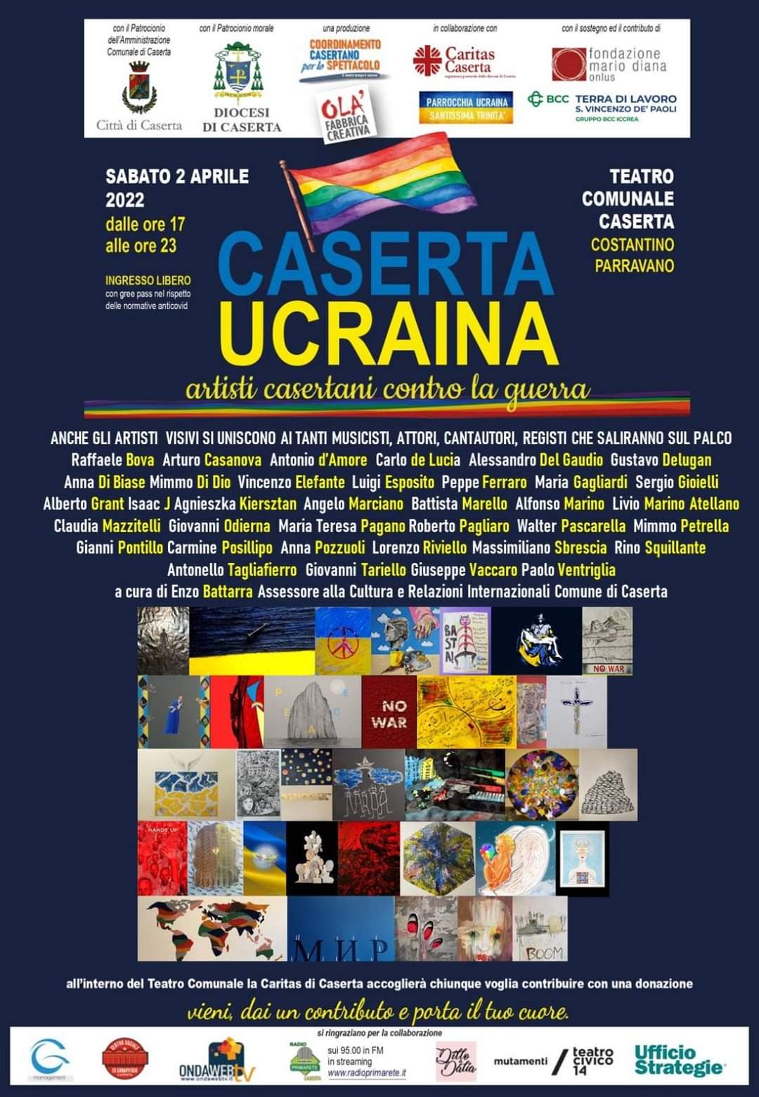 Enzo Battarra, Assessore alla Cultura e alle Relazioni Internazionali del Comune di Caserta, dichiara: “Ci vuole l’arte per costruire la pace! Gli artisti visivi della Terra di Lavoro rispondono all’appello del Coordinamento Casertano per lo Spettacolo contro la guerra. Rispondono con i loro contributi di immagini che sono messaggi di pace, dichiarazioni di intenti, prese di posizione, punti di vista, manifesti. Da Caserta all’Ucraina un’autostrada di solidarietà. Gli artisti sono sempre i primi a scendere in campo per la pace, per un mondo senza frontiere, senza confini, senza limiti. L’universalità dell’arte non conosce e non riconosce mai le ragioni di una guerra. Si è cittadini del mondo, di questo mondo. Alta si alza la voce da Caserta. Gli operatori visivi, i produttori di immagini, si allineano con tutti gli artisti dello spettacolo sull’unico fronte possibile, quello della pace”.