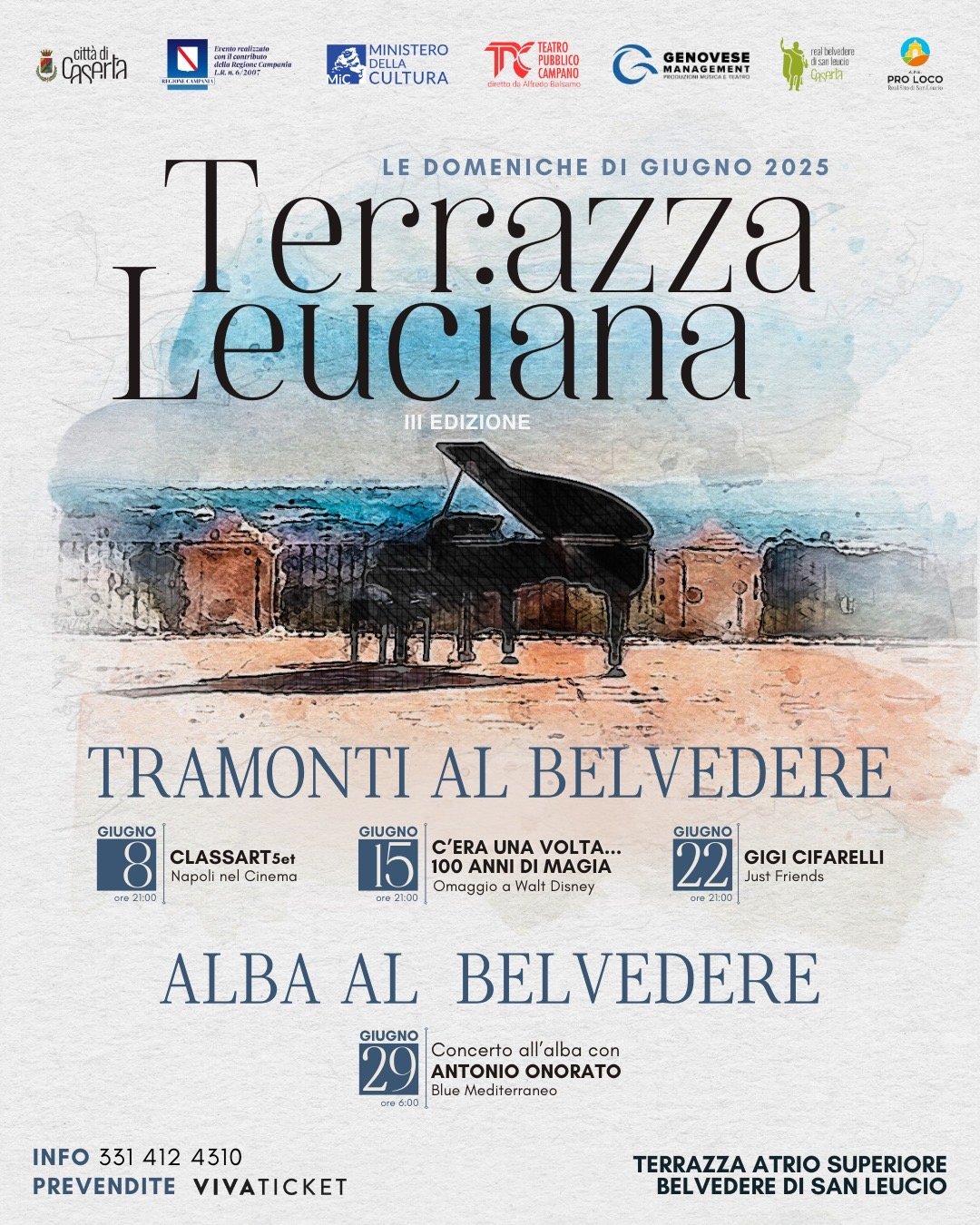 Organizzato dalla Genovesemanagement di Gianni Genovese, patrocinato dal Comune di Caserta e dal Real Sito Belvedere di San Leucio e il supporto del Teatro Pubblico Campano, il festival si ispira alla celebre Terrazza di Ravello, ma si distingue per la sua unicità: la location mozzafiato, che regala una vista panoramica sulla vallata, e un cartellone che spazia dalla classica al jazz, passando per il cinema e l’animazione.