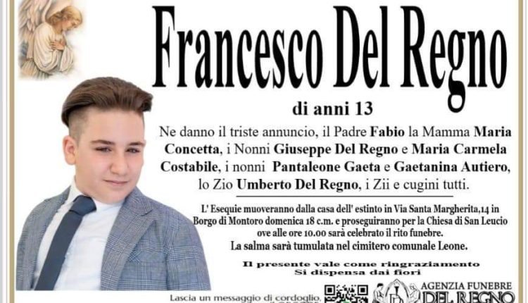 Momenti di profondo dolore e sconcerto a Borgo di Montoro, frazione del Comune di Montoro (AV), che, in queste ore, piange la perdita di Francesco Del Regno, la cui vita si è spenta a soli 13 anni.