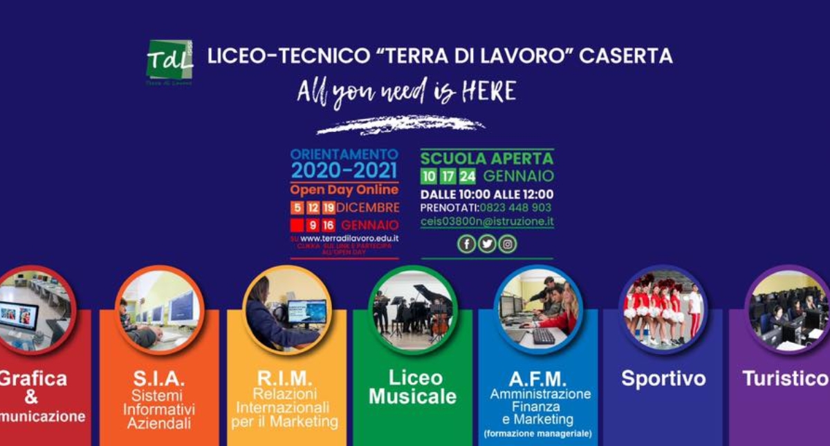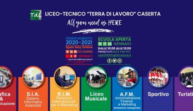 Caserta. Dopo i primi  rilevanti incontri, terzo appuntamento con i docenti dell’Istituto “Terra di Lavoro” per l’Open Day a distanza, coordinati dalla professoressa Mariella Straniero, sabato 19 dicembre dalle ore 9.00 alle ore 12.30, infatti,  nella prima parte dalle 9.00 alle 10.00 ricevono le docenti Anna Lombardi e Carmen Mandara dell’ indirizzo  Turistico e Maria Letizia Desiderio dell’indirizzo Sportivo, dalle 10.00 alle 10.30 nella seconda parte ricevono i docenti Ugo Savino D’Alterio e Guglielmo Grillo del Liceo Musicale, nella terza parte dalle 10.30 alle 11.30 ricevono i docenti Pasquale Varone e Maria Rosaria Giardiello degli indirizzi AFM e RIM (Amministrazione Finanza e Marketing e Relazioni Internazionali per il Marketing) e nella quarta parte dalle 11.30  alle 12.30 ricevono le docenti Pierangela Tommasone e Maria Rosaria Raucci degli indirizzi SIA (Sistemi Informativi Aziendali) e Grafica e Comunicazione. I docenti dei vari indirizzi, accompagneranno i futuri allievi con le loro famiglie mostrando gli ambienti del nostro secolare Istituto con le diverse proposte formative, collegandosi al sito www.terradilavoro.edu.it cliccando comodamente da casa sul link Open day, così come   nei giorni 9 e 16 gennaio, mentre nei giorni  10, 17 e 24 gennaio 2021, vi sarà la possibilità per alunni e genitori di poter visitare l’Istituto in presenza, previa prenotazione.  Questi Open Day – evidenzia la Preside Emilia Nocerino – ancora rigorosamente in modalità a distanza,  dimostrano come il nostro Istituto è sempre aperto al territorio e come evidenziato dallo slogan coniato dagli allievi dell’indirizzo Grafica e Comunicazione “All you need is here” ovvero “Tutto ciò di cui hai bisogno è qui”. Qualsiasi  indirizzo – sottolinea la Preside Nocerino – consente l’accesso a tutte le facoltà universitarie e  molteplici sono gli sbocchi nel mondo del lavoro.  Programmatore, calciatore, dirigente, grafico, musicista, operatore turistico: non importa quale sia il lavoro dei propri sogni, l’importante è scegliere la scuola che aiuti a trasformare i sogni in realtà e il  nostro Istituto  – evidenzia la professoressa Brunella Arena – permetterà certamente   ai futuri studenti di realizzarli.