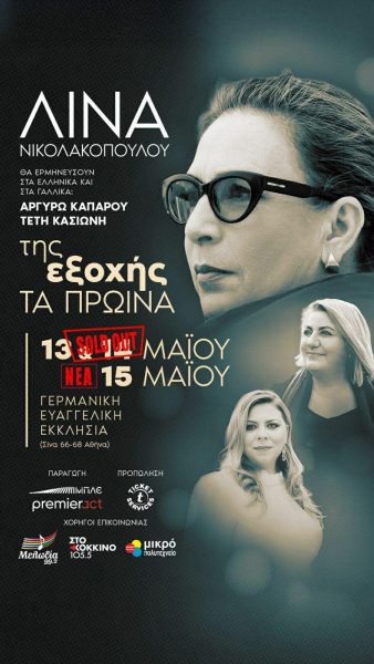 Uno spettacolo costruito sulle opere di Lina Nikolakopoulou che invita ad una mistica esecuzione musicale, con testi selezionati dalle sue canzoni e poesie tradotte in francese dalla compositrice e performer Teti Kassioni. L’esibizione è già stata presentata all’Aia, Lussemburgo e Bruxelles ad un pubblico variegato riscuotendo un grande successo. Questa narrazione si estroflette in una armonica alternanza tra la lingua francese e quella greca, manifestando la delicatezza e la plasticità di queste lingue. I due concerti si terranno nella speciale atmosfera della chiesa tedesca di Atene. Gli interpreti in formazione, Argyro Kaparou e Teti Kassionis (voce) Thymios Papadopoulos, (arrangiamenti e clarinetto – flauto), George Athanasiou, (chitarra classica), Stavros Parginos, (violoncello e mandolino), Anna Psarras e Ilias Conteas per la parte attoriale.