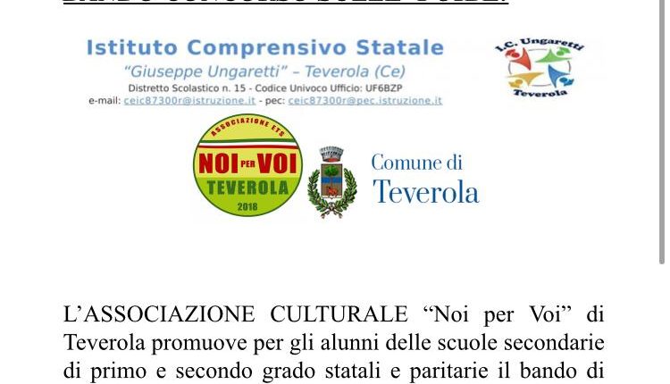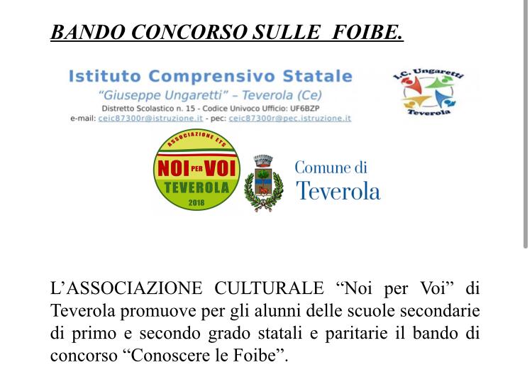 TEVEROLA– L’associazione culturale “Noi per Voi” di Teverola promuove, in collaborazione con l’Istituto comprensivo “Giuseppe Ungaretti” (guidato dalla DS Adele Caputo) e con il patrocinio morale del Comune di Teverola, il bando di concorso “Conoscere le Foibe”, rivolto agli studenti delle scuole secondarie di primo e secondo grado statali e paritarie.