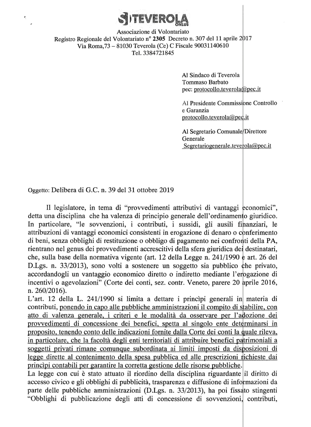 Teverola– In mattinata, il presidente dell’associazione di volontaritato “Si Teverola onlus” ha indirizzato al Sindaco Tommaso Barbato, al Presidente Commissione Controllo e Garanzia e al Segretario comunale una missiva in cui si mette in discussione la delibera di G. C. n.39 del 31 ottobre 2019, con la quale il Comune di Teverola ha concesso il solo patrocinio morale per un evento promosso dall’associazione di cui sopra. Tale delibera non tiene conto degli artt. 33 e 71 D.lsg 117/17, Artt. 3 e 11 ,dello Statuto Comunale e  degli Artt. 2,5,6,7,22 e 23 del Regolamento Politiche Sociali.