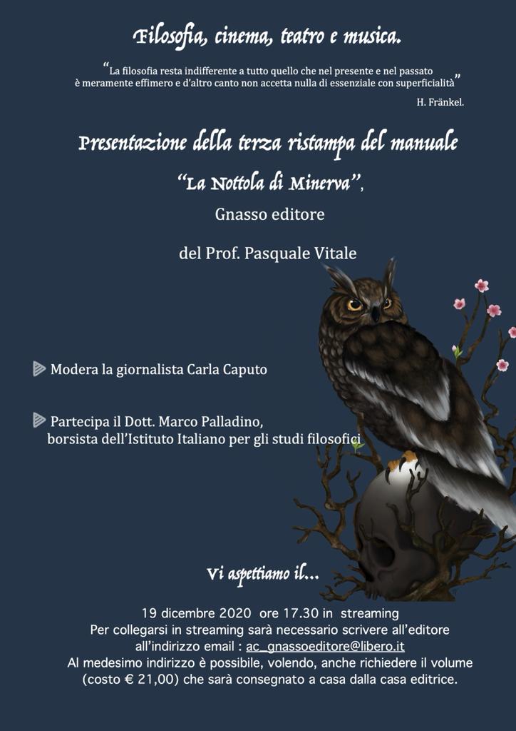 Teverola– Considerata l’impossibilità di tenere presentazioni di testi dal vivo (se non per pochissime persone) la presentazione del volume La Nottola di Minerva-Filosofia contemporanea: dal teatro ai fumetti. Pasquale Gnasso editore, terza ristampa, 2020, avverrà in streaming il 19 dicembre ore 17:30.