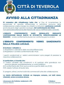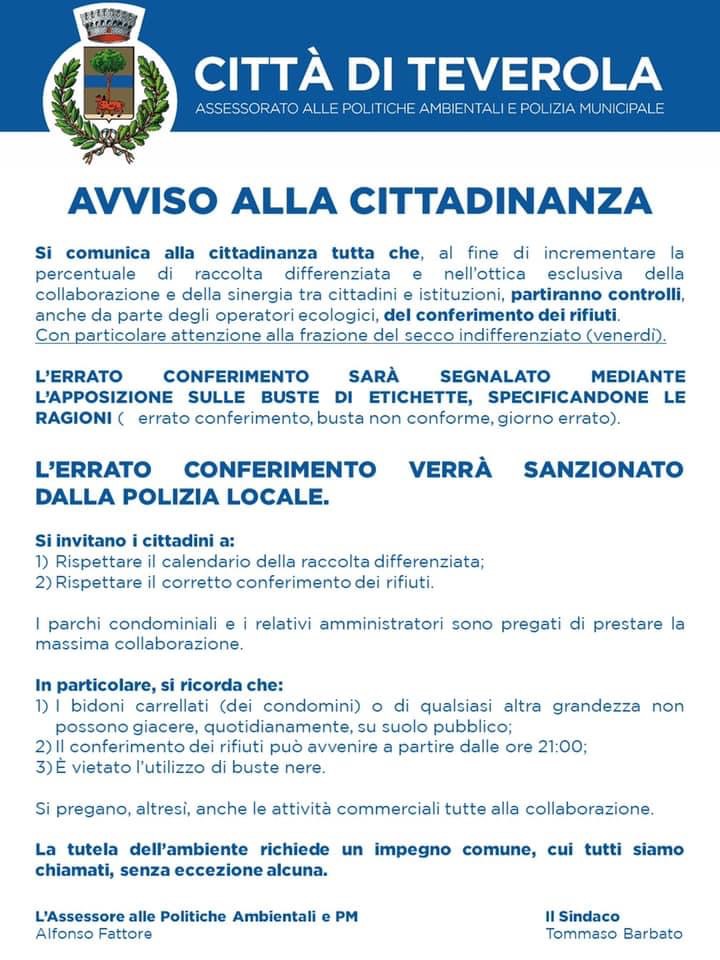 Teverola– “A partire dai prossimi giorni, con particolare attenzione al Venerdì (frazione del secco indifferenziato), partiranno controlli serrati da parte degli operatori ecologici in sinergia con la Polizia Locale.