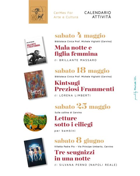 A tale scopo l’Associazione Cermes invita ai diversi incontri che inizieranno oggi pomeriggio 4 maggio presso la biblioteca civica “Michele Vigliotti” alle ore 17:30 e si concluderanno l’8 giugno con la scrittrice Silvana Perno, influencer con il suo famosissimo format dal nome “Napoli Reale”, presso la villetta padre pio di messercola.