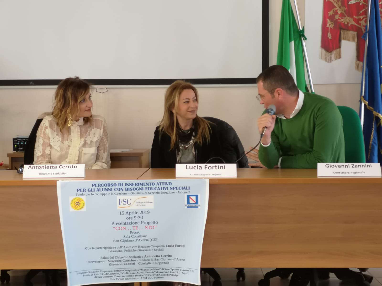 Si è tenuto questa mattina il tour istituzionale del consigliere regionale Giovanni Zannini, insieme all’Assessore regionale Lucia Fortini, presso i comuni di San Cipriano d’Aversa, San Marcellino e Parete. Ad accogliere il consigliere e l’Assessore regionale a San Cipriano, presso l’Istituto Comprensivo Mattia De Mare, il sindaco Vincenzo Caterino e il Dirigente scolastico Antonietta Cerrito, per il progetto “Contesto” riservato agli alunni con bisogni educativi speciali in virtù del bando regionale BES che mette insieme sei istituti del territorio (l’I.C. “Mattia De Mare” e il Liceo “E.G. Segrè” di San Cipriano d’Aversa, l’I.C. di Carinaro, l’I.C. di Cesa, l’I.C. “G. Parente” di Aversa, l’Istituto Tecnico “G.Carli” di Casal di Principe) e l’associazione ANSI C.C.C.