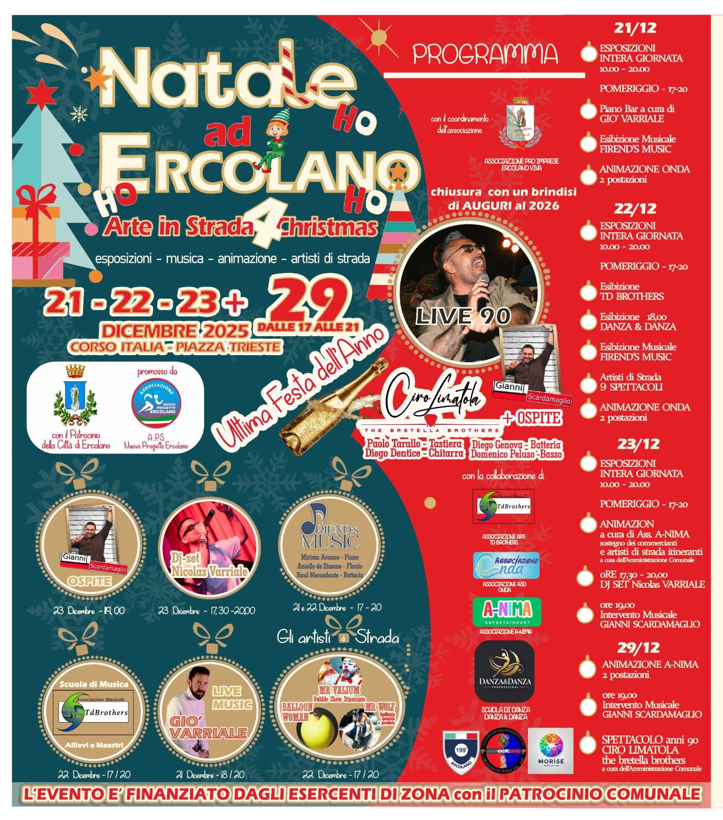 Il gran finale è fissato per il 29 dicembre in Piazza Trieste, con un evento fortemente voluto dagli esercenti e interamente supportato dall’ente: una festa di fine anno a tema Anni ’90, con Ciro Limatola, i Bretella Brothers e la collaborazione di Gianni Scardamaglio.