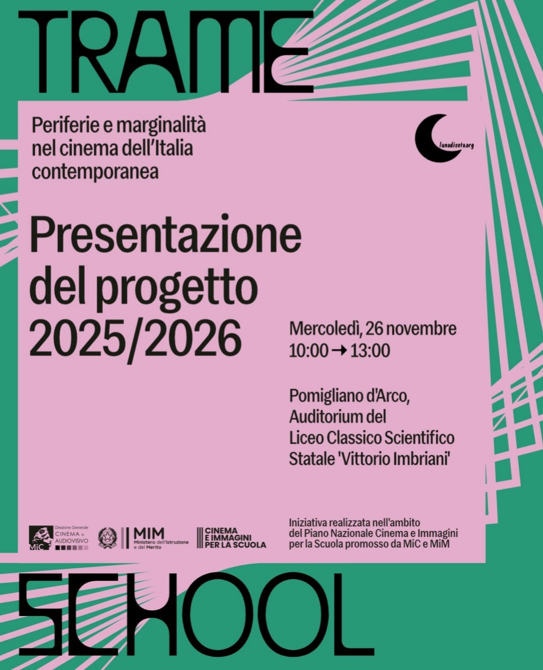 MERCOLEDÌ 26 NOVEMBRE ALL’AUDITORIUM DEL LICEO IMBRIANI DI POMIGLIANO D’ARCO SI TERRÀ LA PRESENTAZIONE DEL PROGETTO “TRAME SCHOOL – PERIFERIE E MARGINALITÀ NEL CINEMA DELL’ITALIA CONTEMPORANEA 2025/2026”