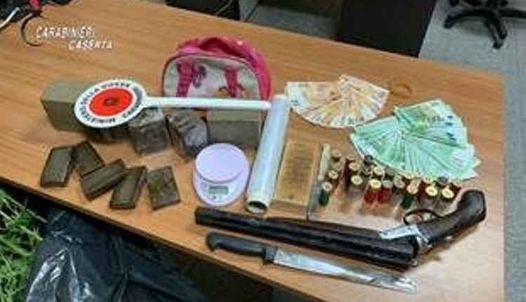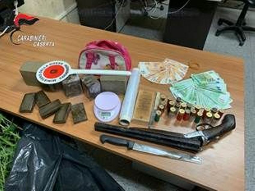 La successiva perquisizione domiciliare effettuata in San Felice a Cancello presso l’abitazione dei congiunti ha permesso di recuperare 7 piante di marijuana dell’altezza di 1,60 metri, ulteriori 7,5 gr. di sostanza stupefacente tipo hashish, materiale per il confezionamento, un fucile marca Pietro Beretta, non censito ed illegalmente detenuto e modificato con il taglio delle canne per accrescerne il potere offensivo, nr. 21 cartucce cal. 12, nr. 3 cartucce calibro 16, nonché euro 5.035 in banconote di vario taglio.