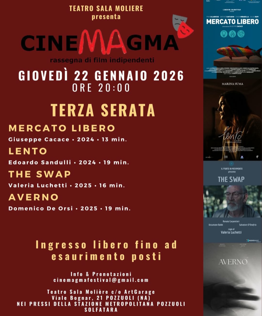 Continua con il terzo appuntamento, domani, giovedì 22 gennaio 2026, alle ore 20.00, al Teatro Sala Molière di Pozzuoli (in ArtGarage – Via Bognar, 21) diretto da Nando Paone, “Cinemagma”, la rassegna di film indipendenti selezionati dallo storico del cinema Giuseppe Borrone e giunta alla sesta edizione. Lo scopo dell’iniziativa, presentata dall’Associazione Culturale I Dieci Mondi, è quello di offrire una vetrina ai talenti emergenti del cinema italiano, focalizzando l’attenzione sul formato breve del cortometraggio.