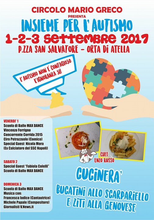 ORTA DI ATELLA – Appuntamento per questo fine settimana ad Orta di Atella con le tre serate di beneficenza per bambini speciali che si terranno nei giorni 1/2/3 settembre 2017 in piazza San Salvatore ad Orta di Atella. Musica, Cabaret, Arte, Teatro, Balli, Stand gastronomici, Stand culturali, Sport, Animazione. Ospiti importanti, animeranno per tre giorni la città di Orta di Atella. Le serate organizzate avranno come scopo il sorriso magico di tanti bambini autistici e disabili. Michele Pisano, insieme ai suoi due soci Vincenzo Russo e Francesco Canciello, vorrebbe lanciare con queste serate organizzate in piazza un messaggio volto alla sensibilizzazione sociale verso il tema dell’autismo. Prenderanno parte tanti ospiti della cultura, del giornalismo provinciale, della politica, dello spettacolo, dello sport, del sociale che metteranno in quelle tre serate a disposizione della causa la loro testimonianza sulla tematica sociale. L’evento di Orta avrà come scopo il sostegno, ma soprattutto l’importanza della conoscenza delle attività sociali da svolgere in città con le reti associative locali impegnate nella promozione e nello sviluppo di azioni di sostegno per i bambini speciali e le loro famiglie. “Tutta Orta di Atella è invitata alla manifestazione” – ha affermato Michele Pisano che ribadisce ai canali di comunicazione provinciali di girare cortesemente l’invito a partecipare a questa iniziativa. Michele Pisano afferma insieme ai due soci che lo stanno aiutando nella dettagliata organizzazione della manifestazione che lo scopo finale, è il sorriso di tutti i nostri bambini. “Con questa manifestazione” – ha aggiunto Michele Pisano – “noi tutti genitori vogliamo raggiungere chi ancora non ci conosce; coloro che, per lavoro e attitudine, non frequentano normalmente realtà sociali, ma anche cari amici che conoscono le realtà come quella di Orta e ancora ci seguono. Attraverso un evento “mondano” vogliamo far apprezzare l’importanza di questi bambini, il nostro impegno” – ha aggiunto – “risulta da sempre vero e pieno di tante cose belle per i bambini e le loro famiglie … oltre a far sostenere i nostri progetti”, dicono concludendo, gli altri due soci Vincenzo Russo e Francesco Canciello che affiancano Michele Pisano nell’allestimento della manifestazione di piazza. Lo scopo finale dell’evento avrà come obbiettivo educativo la rivalutazione dei momenti di socializzazione e integrazione sul territorio di Orta per tutti i bambini speciali della città.